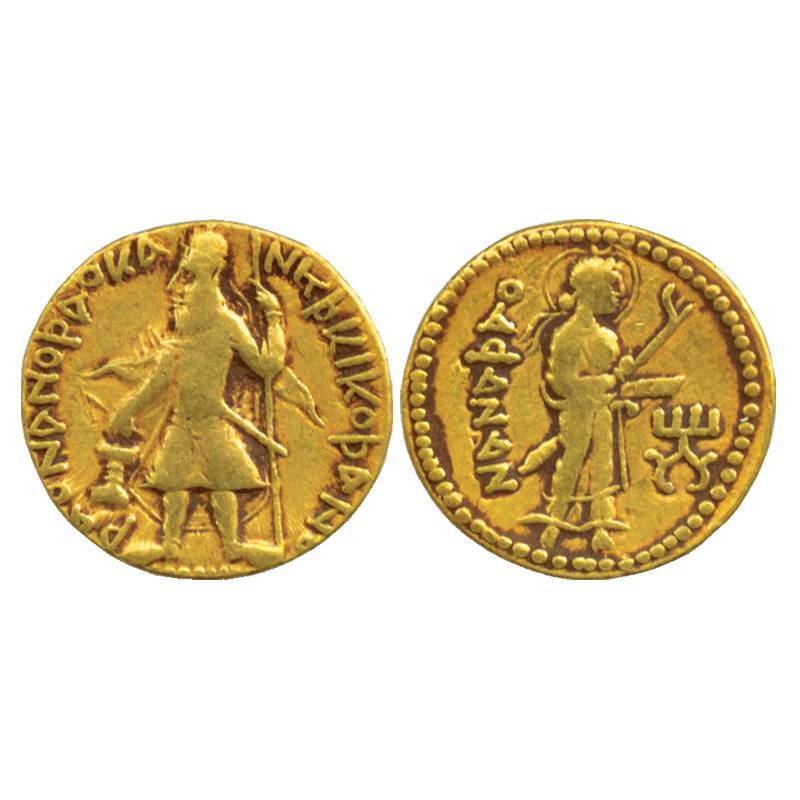 | Kushans, Kanishka (c. 127-155AD), Gold Stater, 'Nanashao' type, Goebl 60, 7.90g. Obv: King standing holding a spear and offering sacrifice at an altar, Bactrian legend ShAONANOShAOKANEShKIKOShANO around; Rev: Fertility goddess 'Nana' standing holding a sceptre; Tamgha in the right field,Bactrian legend NANAShAO to left. |